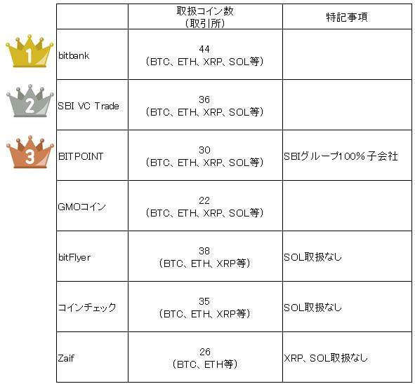 - 取扱コイン数は以下の通り