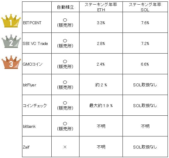 主要7取引所の自動積立、ステーキング(ETH/SOL)